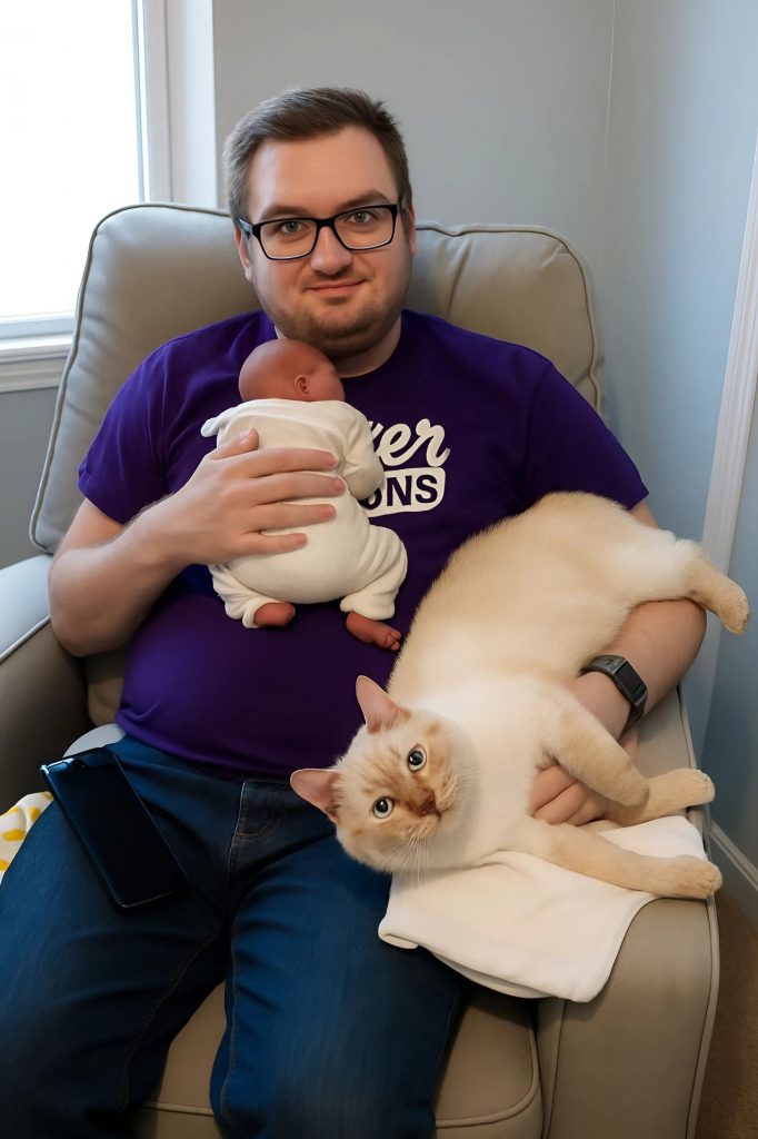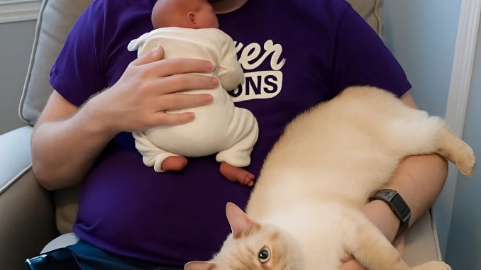 Kin était assis dans le fauteuil, tenant le bébé dans ses bras. Le petit s’était recroquevillé, blotti contre sa poitrine, respirant calmement, comme si le monde entier était soudain devenu sûr. Kin le serrait d’un bras et le caressait doucement de l’autre — exactement comme je le fais d’habitude. Sur ses genoux, notre chat Mango ronronnait paisiblement, comme si c’était leur rituel du soir.