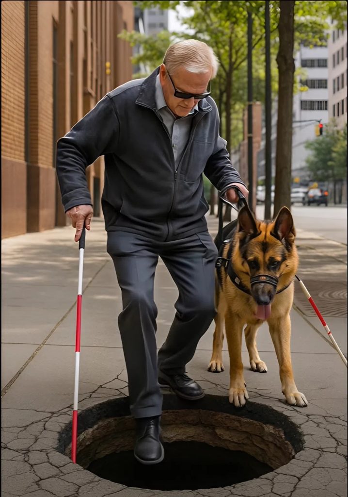 Ignorant tout, l’homme avançait, sa canne frappant le sol avec un rythme rassurant. Rex marchait légèrement en avant, la laisse tendue. Mais soudain, le chien s’arrêta net, les oreilles dressées. Il sentit le danger. L’homme, ne comprenant pas, fit un pas de plus. La canne toucha le vide. En une fraction de seconde, le sol s’effondra sous lui. Son corps bascula.