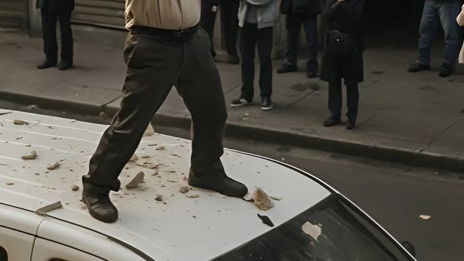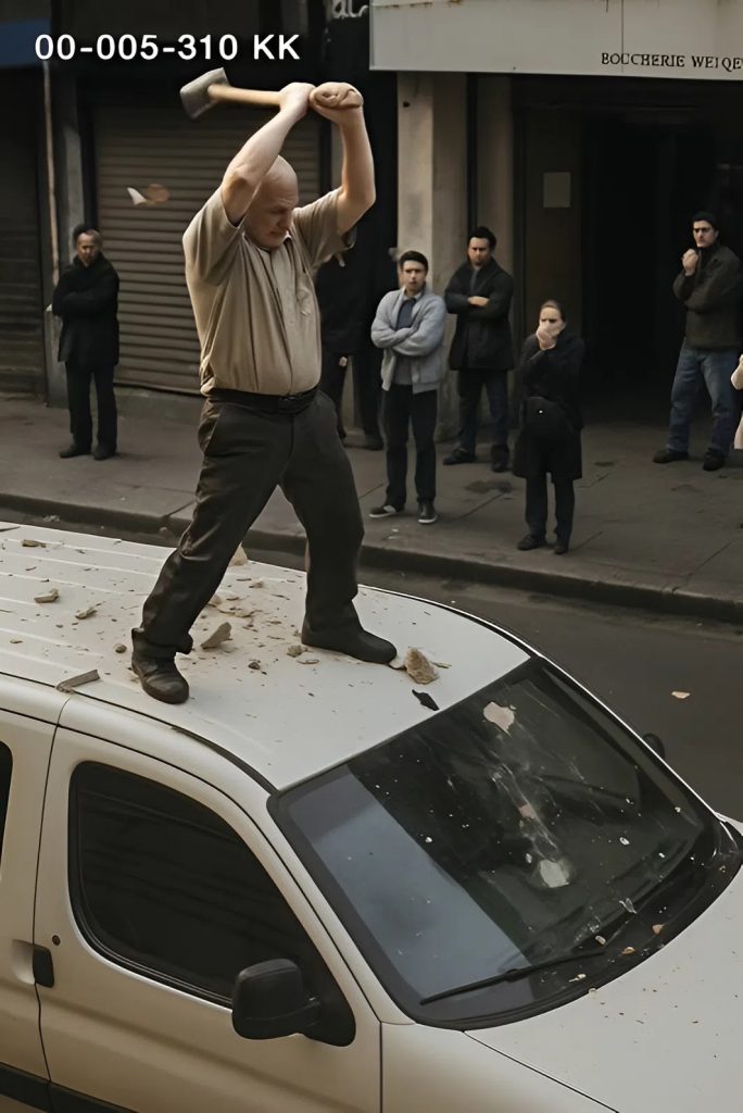 Sur le toit d’un fourgon blanc se tenait un homme âgé, aux cheveux gris épars, tenant dans ses mains une masse imposante. À chaque mouvement de ses bras, l’outil décrivait un arc brutal dans l’air avant de s’abattre sur la tôle avec une violence qui glaçait le sang. Le métal se tordait, se crevassait, la peinture éclatait en éclats qui retombaient en pluie sur le sol. Le pare-brise, intact quelques minutes plus tôt, se zébrait de fissures jusqu’à exploser en un nuage de fragments scintillants.