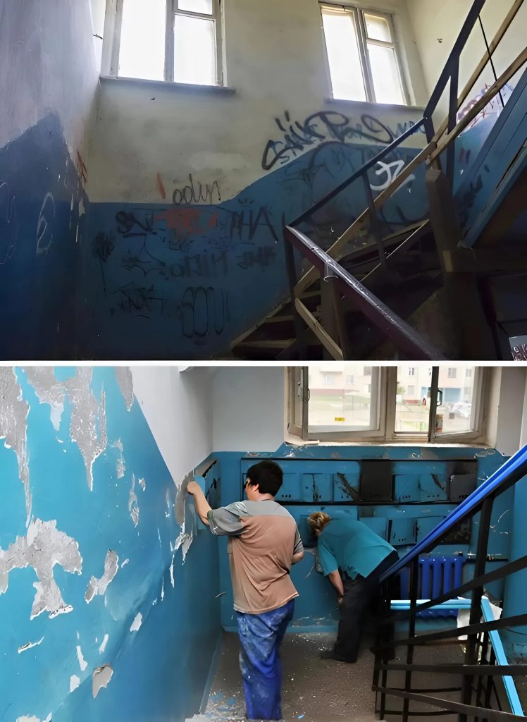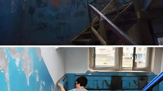 Lorsque le premier seau de peinture a été ouvert, une odeur fraîche, presque enivrante, a rempli le hall. Les voisins qui descendaient les escaliers se sont arrêtés net. On aurait dit que les murs, muets depuis des années, retenaient leur souffle.