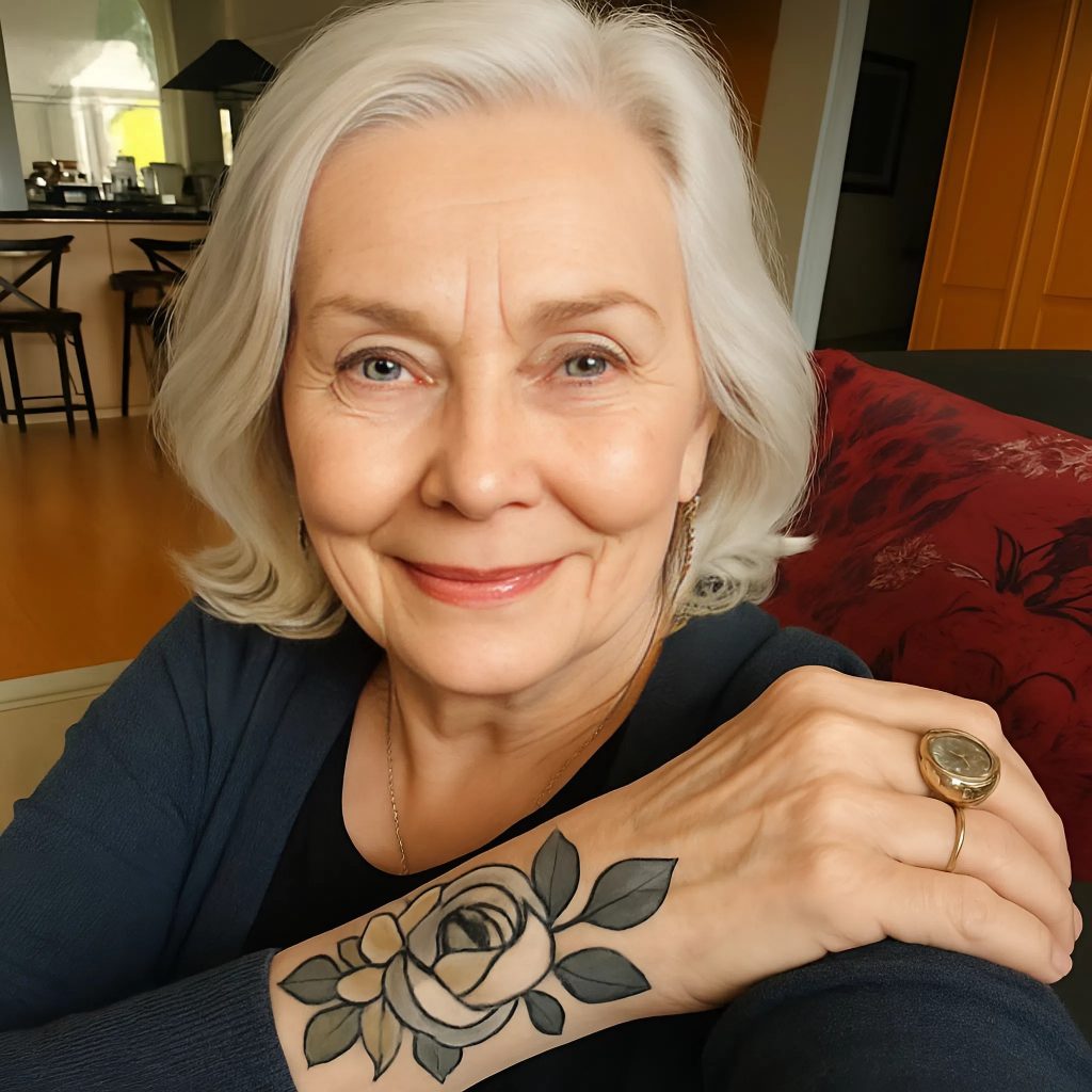 Dans le salon de tatouage, au milieu d’une atmosphère douce et chaleureuse, elle choisit un dessin fin et élégant qui reflète son parcours de vie. Lorsque le tatoueur termine son travail, Alice ne peut détacher son regard — le tatouage brille sur sa peau comme un rappel : l’âge n’est qu’un chiffre, sans pouvoir sur l’âme. 🤔