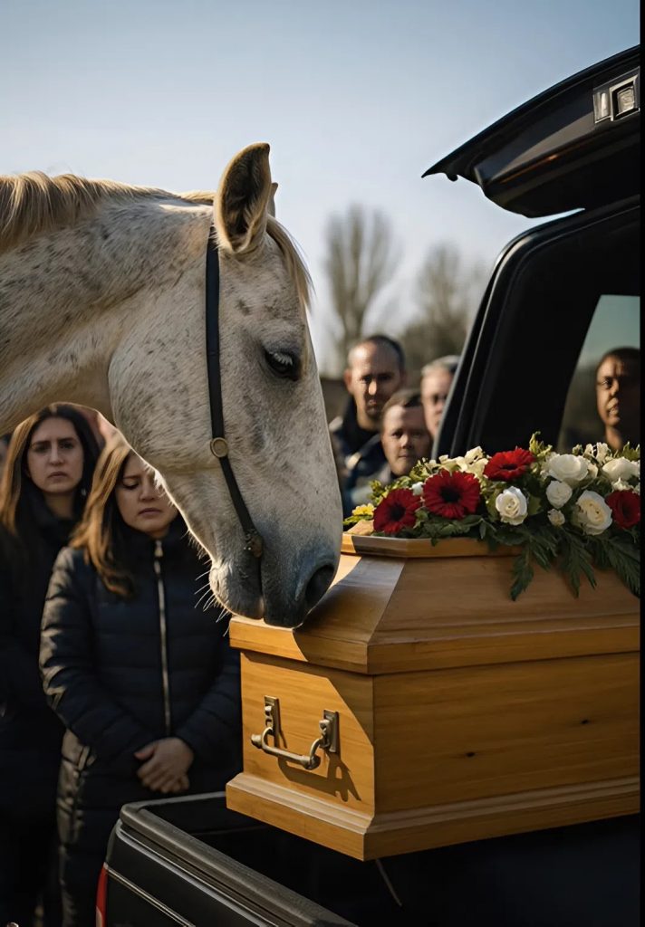 Les gens s’arrêtèrent, pétrifiés. La jument s’avançait lentement, un pas après l’autre, jusqu’à ce qu’elle se tienne juste devant le cercueil. Puis, sans un son, elle abaissa la tête et effleura le bois du museau, comme pour réveiller celui qui dormait à l’intérieur. Un souffle s’échappa de ses narines, long et tremblant. À ce moment précis, le silence devint total : on n’entendait plus ni vent, ni voix, ni pas.