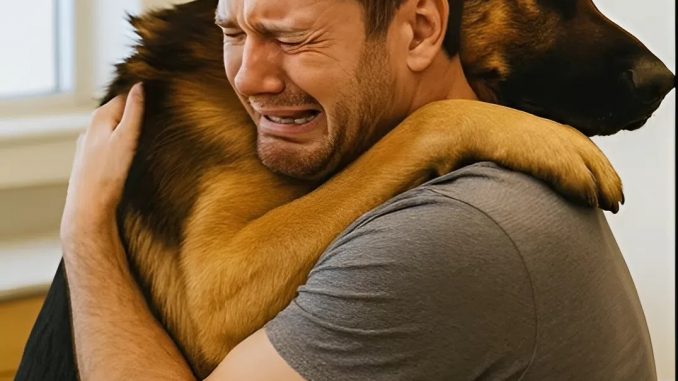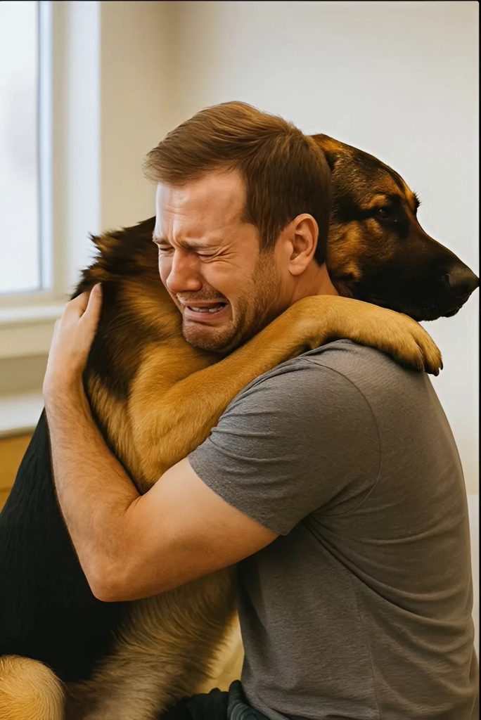 Le chien, comme s’il comprenait chaque mot, posa ses pattes sur les épaules de son maître et se colla à lui. L’homme le serra fort et éclata en sanglots.