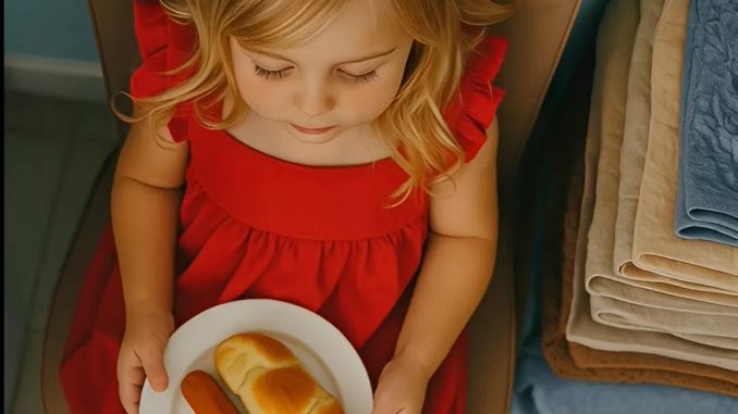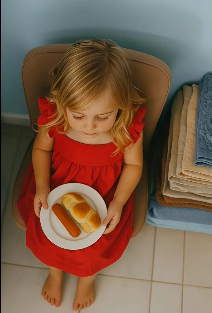 Elle installa ma fille sur une chaise pliante dans la buanderie, à côté d’une pile de serviettes et du bruit de la machine à laver. Sur son assiette, une simple saucisse et un morceau de pain sec.