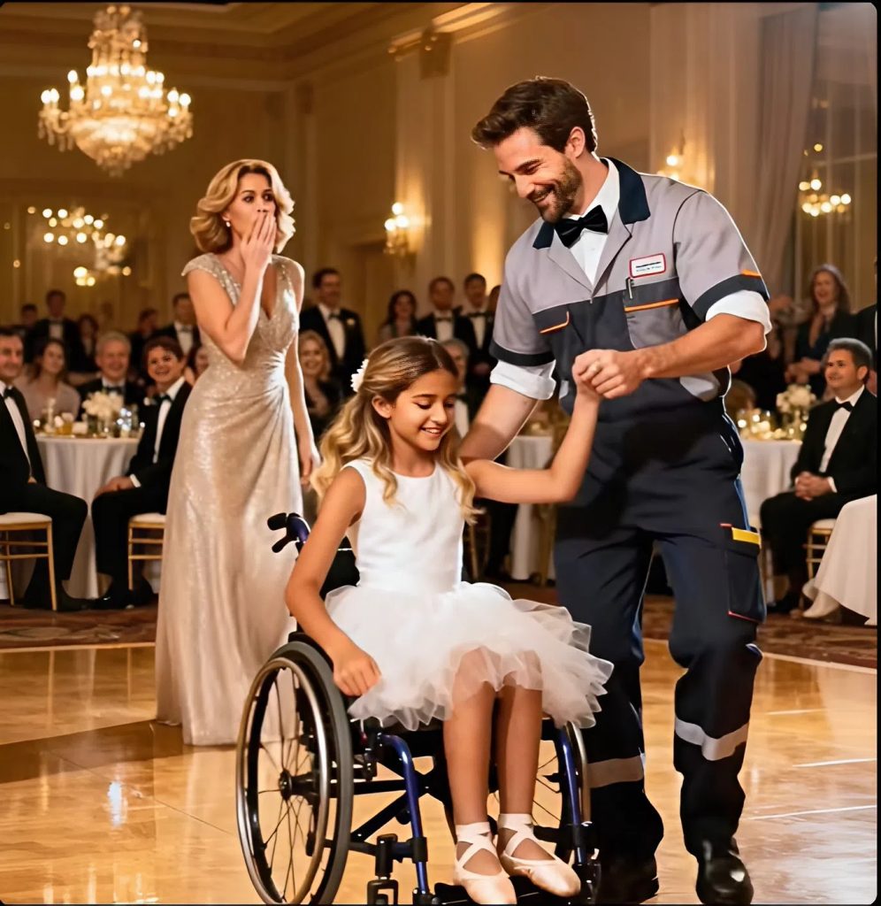 Une fillette d’une dizaine d’années approchait dans un fauteuil roulant. Elle avait de longs cheveux blonds qui captaient la lumière des guirlandes et une robe blanche, choisie visiblement pour une occasion spéciale. Ses doigts fins serraient les accoudoirs, mais ses yeux brillaient d’un mélange étrange de timidité et de courage.