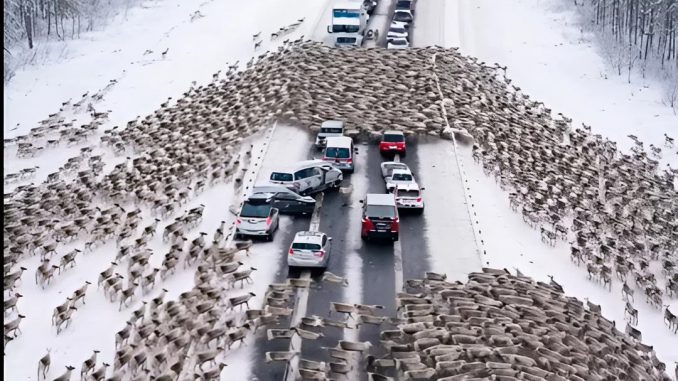 Un premier renne surgit entre les sapins, puis un deuxième, puis un troisième. En un clin d’œil, la situation devint irréelle : des dizaines, puis des centaines de rennes déboulèrent dans un chaos parfait, traversant la route à toute vitesse. Les animaux couraient tous dans la même direction, vers le nord, sans jamais tourner la tête, sans hésiter, comme fuyant une menace invisible. Jamais personne n’avait vu un troupeau d’une telle ampleur.